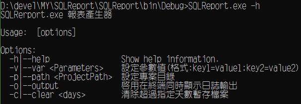 -p 專案目錄 範例 SQLReport.exe -p C:\銷售日報表作業